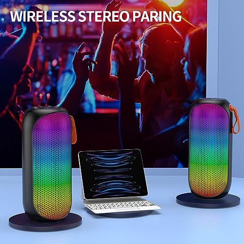 Immerse Yourself in a Light Show: Our portable Bluetooth speaker boasts RGB lights that pulse to the beat of your music. Create an unforgettable party atmosphere with mixed color flashes that sync with your favorite tunes. Enjoy seamless connectivity with the latest Bluetooth 5.3 technology for quick, stable connections with your devices.