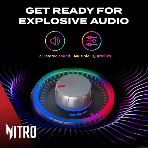 Features: - Free Your Head from Headphones: Experience immersive audio without the hassle of headphones. From sharp sniper shots to powerful explosions, this compact yet powerful soundbar elevates your gaming experience. - Advanced Nitro Pulse RGB Lighting: Celebrate your victories with customizable RGB lighting effects that sync with your gameplay, creating the perfect atmosphere for every moment. - Compact and Space-Efficient Design: At 16.5 inches long, this soundbar fits perfectly under your monitor, offering rich stereo sound without taking up much space. - Effortless USB Plug-N-Play for PC & Mac: Simplify your setup with a single USB-C or USB-A cable that provides both power and audio. No additional 3.5mm connection needed. - Seamless Connection with Android Phones: Enjoy better audio on the go by plugging the included USB-C cable into your Android smartphone. - Versatile Connectivity: Use Bluetooth 5.0 for wireless connections to phones, tablets, gaming consoles, and laptops, or connect via the included 3.5mm audio cable for a wired setup. - Customizable EQ Profiles: Optimize your audio by switching between Game, Movies, and Music modes for a fully immersive experience tailored to your activity.